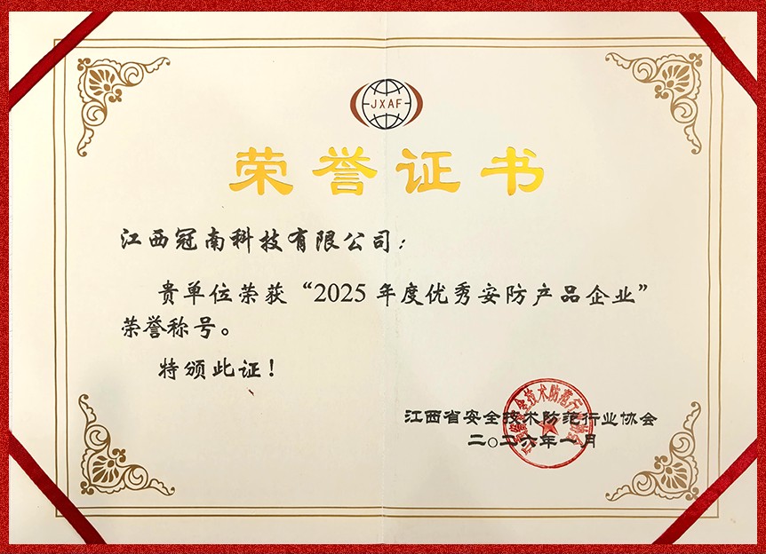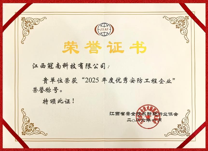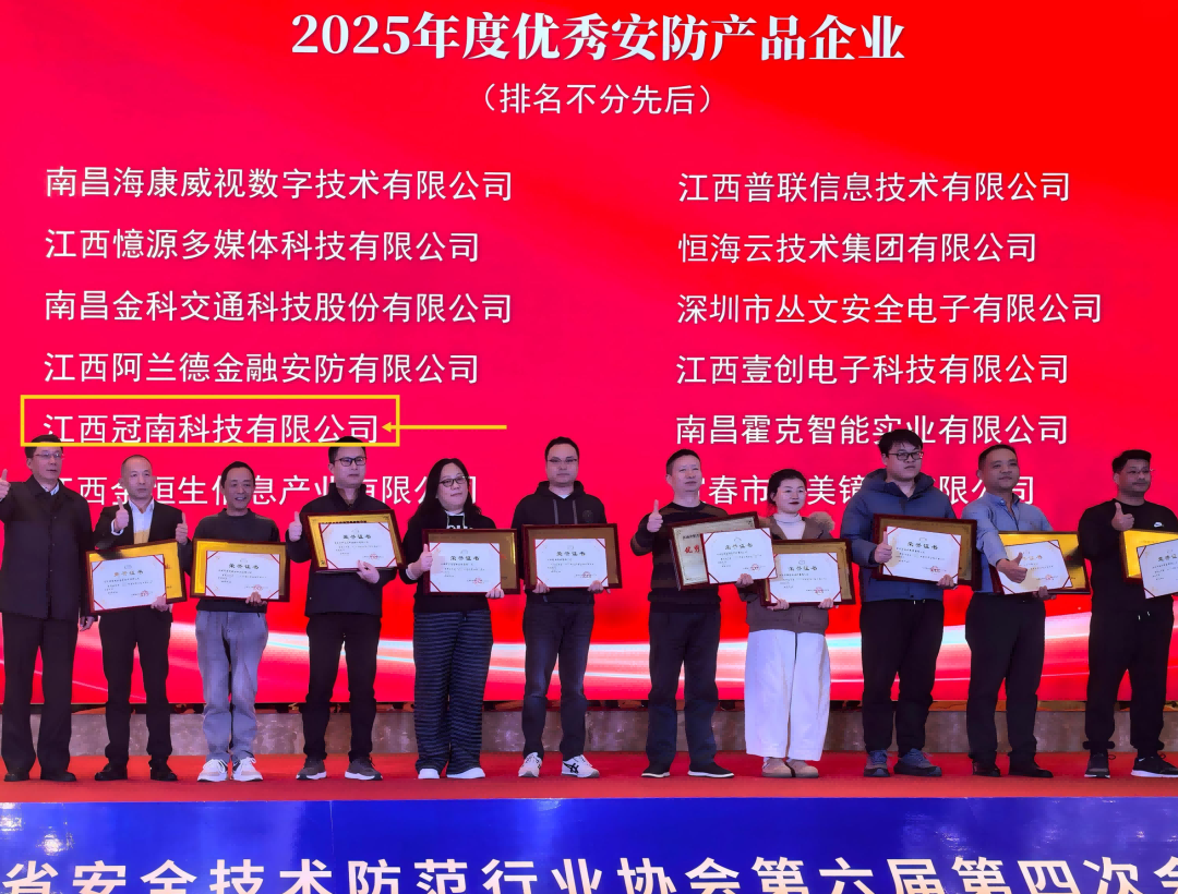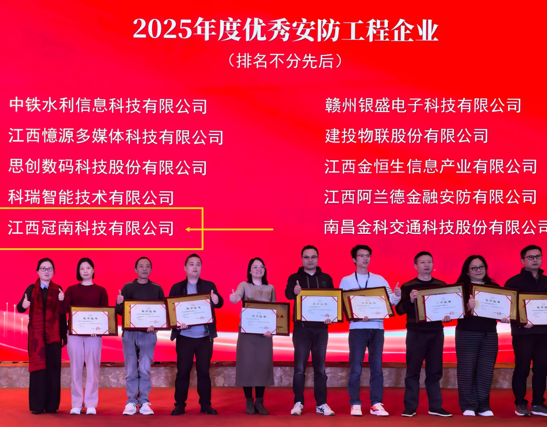 经江西省安防协会专家组评审:江西冠南科技有限公司荣获“2025年度优秀安防(工程)企业荣誉称号”、“2025年度优秀安防(产品)企业荣誉称号”。这份双喜临门!不仅是对冠南科技过去一年努力的肯定,更是对我们多年来坚持“提供高效优质的工程服务,提供专业、定制化的产品服务”理念的最好回馈。